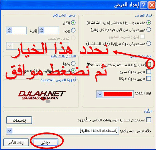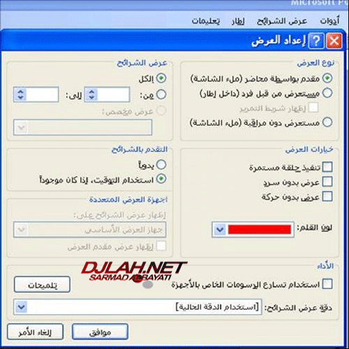 نفتح عرض الشرائح من شريط المهام في الاعلى .. ثم اعداد العرض .. فتظهر لنا هذه النافذة