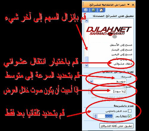 قم بتنزيل الصفحه الى الاخر في خانه تطبيق على الشرائح المحدده و حدد انتقال عشوائي .. بعد ذلك نقوم بتحديد السرعة الى متوسط .. نقوم بتحديد تلقائيا بعد .. نترك الصوت دون أي شيء .. بعد ذلك نضغط على زر تطبيق على كافة الشرائح .