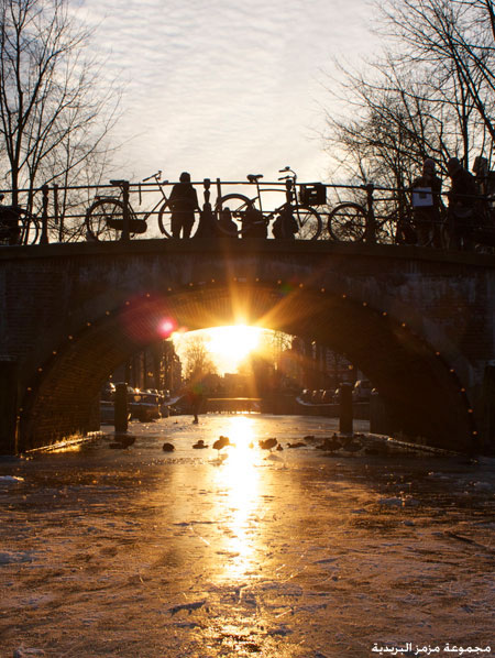 قناة أمستردام في لحظة من السكون أثناء مغيب الشمس.