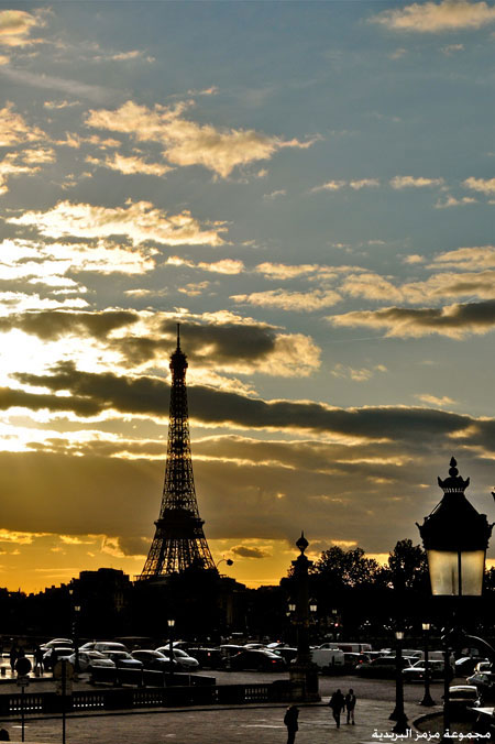 الغروب يحيط ببرج إيفل بداخل ميدان الكونكورد.