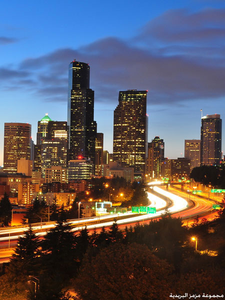 حركة المرور المسائية تنير وسط مدينة سياتل.
