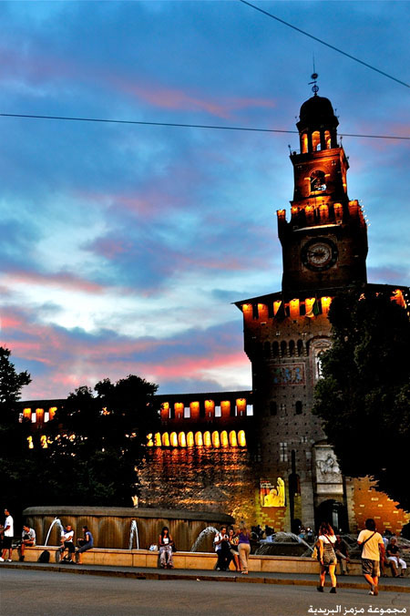 منظر لقلعة سفورزا في ميلانو أثناء غروب الشمس.