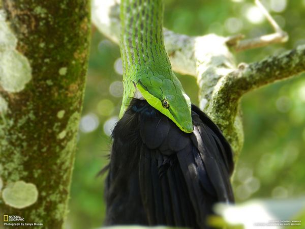 الثعبان الأخضر الشرس يبتلع أحد أنواع الطيور الأمريكية في بليز ، أمريكا الوسطى