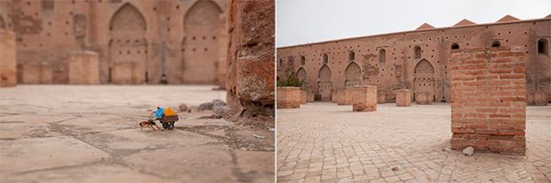 الصورة التالية لأحد الأماكن التاريخية في المغرب حيث يوجد جسم لشخص على عربة يجرها صرصور.