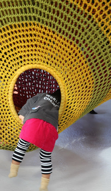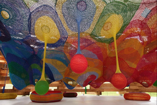 لقد صنعت الفنانة توشيكو هذا الفناء حيث يستطيع الاطفال التفاعل مع اعمالها