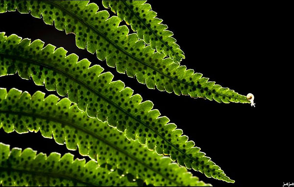 استأثر الحلزون الصغير بالاهتمام بحيث لم تلتقط له الصورة إلا بعدما وصل إلى نهاية نبات السرخس