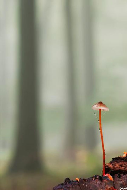 صورة للحياة النباتية في بريطانيا تظهر فطريات صغيرة وإلى جانبها أشجار ضخمة