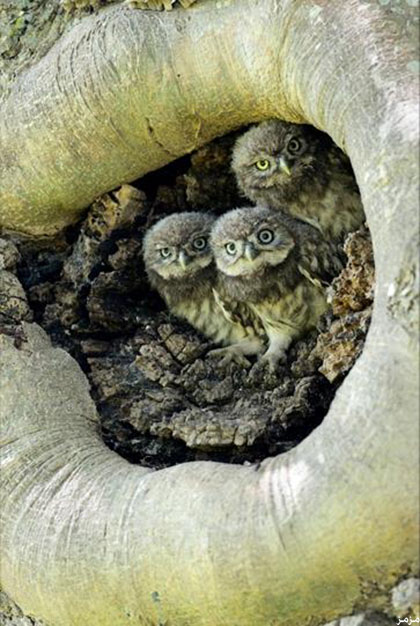 صورة لثلاث فراخ صغيرة لبومة وهي تحملق في اتجاه ملتقط الصورة