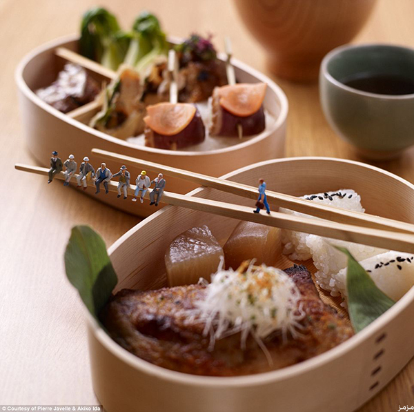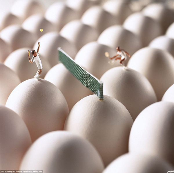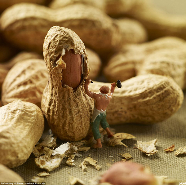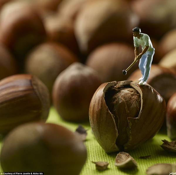على طريقة “رحلات جليفر”، قدم مصوران فرنسيان تجربة مدهشة، عن صور لتماثيل بشر في حجم “عقلة الإصبع”، يخوضون مغامرات مذهلة على أسطح أنواع عملاقة من الطعام، من مباراة تنس على سطح ثمرة “حبحب”، إلى استخدام الآلات لتقشير “الفول السوداني”، ومن نفخ حبة “عنب”، إلى التزلج داخل ثمرة “أفوكادو”. وحسب صحيفة “الديلي ميل” البريطانية، بدأ الزوجان الفرنسيان: أكيكو إيدا، وبيير جافيل، منذ عام 2002، سلسلة من مجموعات التصوير، أطلقوا عليها “الصغار”، وفيها تماثيل بشر بحجم عقلة الإصبع، يقومون بما يقوم به الناس من أعمال يومية، لكنهم يتحركون على أطباق، وثمار، وخضروات، وفواكه عملاقة، يبدو معها هؤلاء البشر شديدي الصغر.
