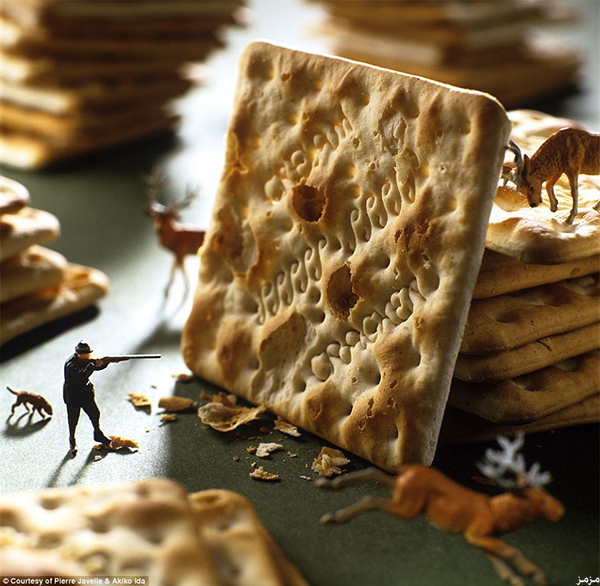 وتضيف “الصحيفة”: تضم سلسلة الصورة ملامح تماثيل صغيرة، تقوم بتقشير الفول السوداني العملاق، أو لعب التنس على “الحبحب”، وهناك من يحاول ضخ الهواء في “الزبيب”، كأنما يريدها أن تتحول إلى حبات “عنب” طازجة، وهناك من يطلق النار من بندقية على قطعة “بسكويت”. وسيقدم العمل من خلال قاعة “مادلين جوردان” للفنون التشكيلية في نيويورك.