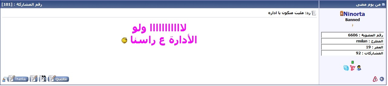 - لما بتشوفو موضوع بغير قسمو او فيو شي مو منيح او شي مو طبيعي , لا تردو عالموضوع او تحاورو صاحب الموضوع او تقتبسو شي من الموضوع لأنو رح يتعدل او ينحزف و انما كبسو على "التقرير بمشاركة سيئة" و نحن منتصرف.