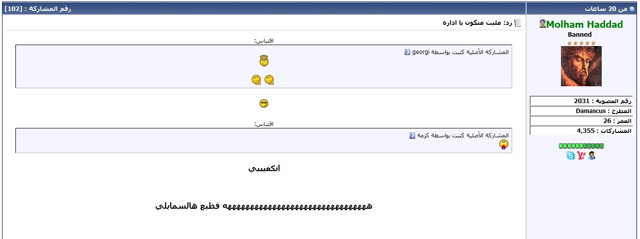 - لما بتشوفو مشاركة سيئة او مكررة او مو بمحلها او فيا شي مو منيح , لا تردو عليها او تحاورو صاحب المشاركة او تقتبسو من المشاركة لأنو رح تنحزف او تتعدل , وانما كبسو على "التقرير بمشاركة سيئة" و نحن منتصرف.