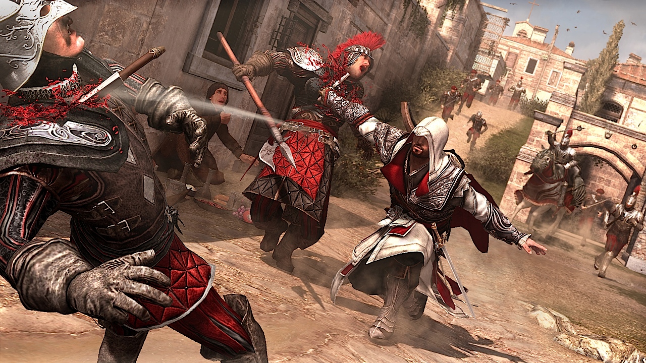 الجهاز يدوب شغل الجزء Assassin's Creed Brotherhood مع العك شوي ووصلت لبعد مقتل العم ماريو بالهجوم ع المدينة وهرب ايزيو لروما هلأ عم يستكشف يلي فهمتو لتأسيس مجموعة لينتقم من القيصير